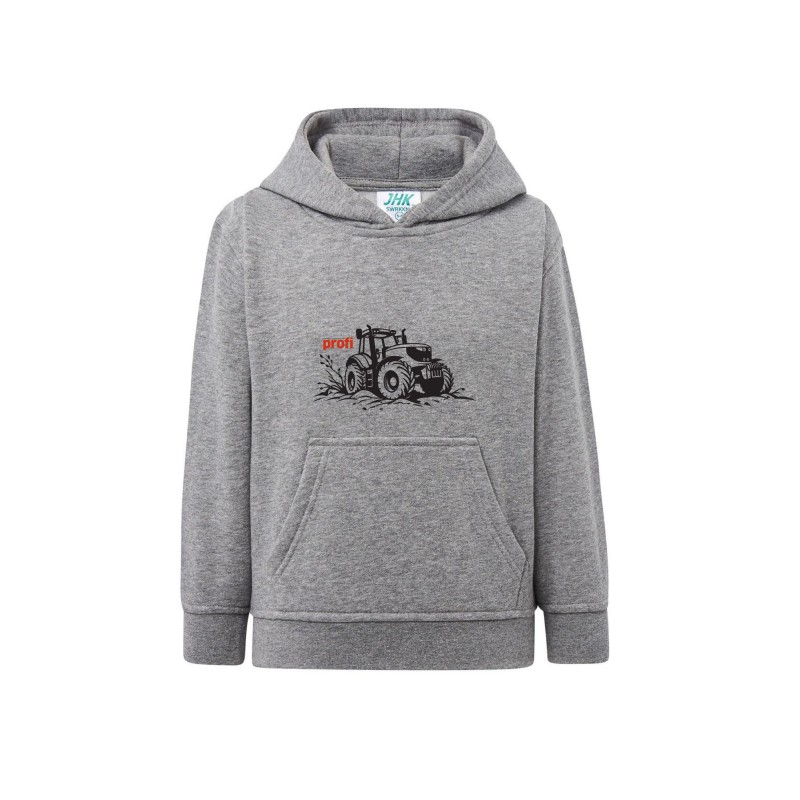 Szara bluza z kapturem dla dzieci z nadrukiem traktora i logo „profi”. Ciepła, wygodna i praktyczna — świetna na co dzień i do zabawy na świeżym powietrzu.